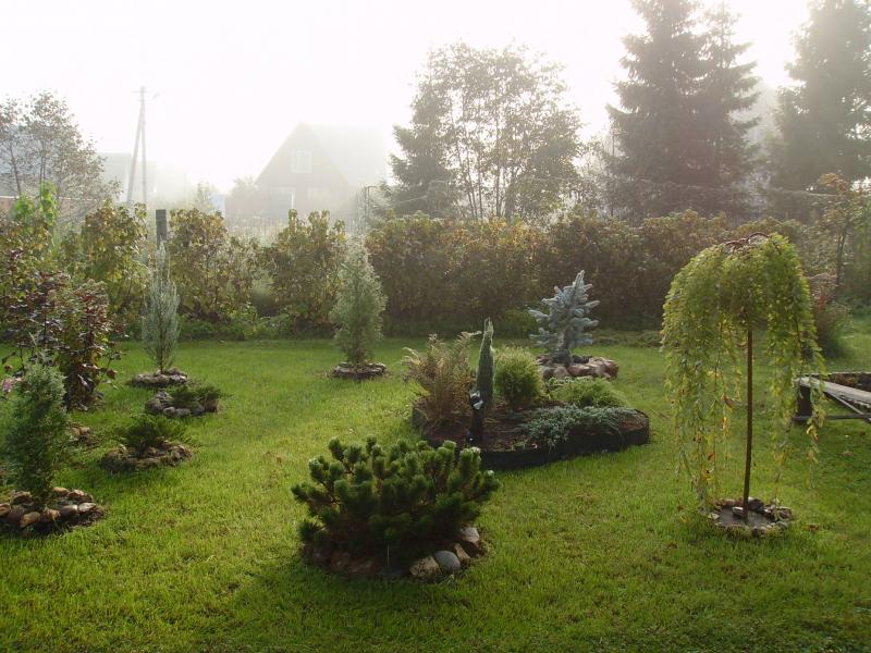 Утренний туман в молодом хвойном садике