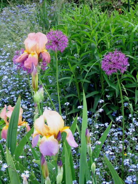 Ирисы и лук в незабудковых волнах