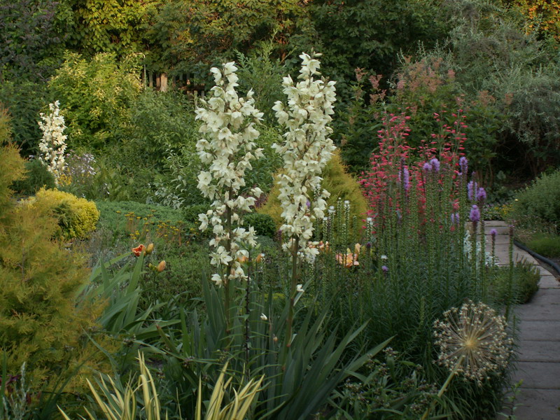 На переднем плане (да и на заднем) юкки нитчатые. Вполне вписываются в общую композицию вместе с лиатрисом колосковым и пенстемоном бородатым. Все эти растения - североамериканцы.