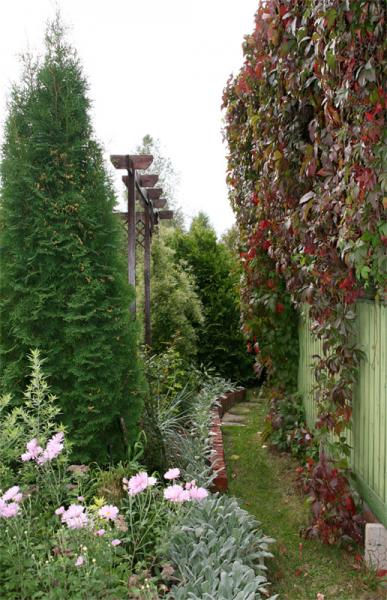 Перголу продлили вдоль дома для вновь приобретенных плетистых роз, а подпорная стеночка укрепила край приподнятой рабатки