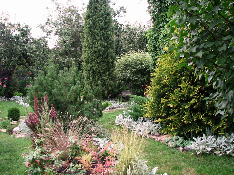 От холодного северного ветра этот уголок загораживает крыльцо дома, увитое виноградом, а туи, можжевельники и горная сосна образовали зеленый кабинет