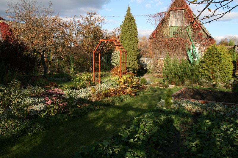 У осени в моем саду есть свои солнечные часы - как только тени от перголы доползают до арки, надо заканчивать работу - через полчаса будет совсем темно.