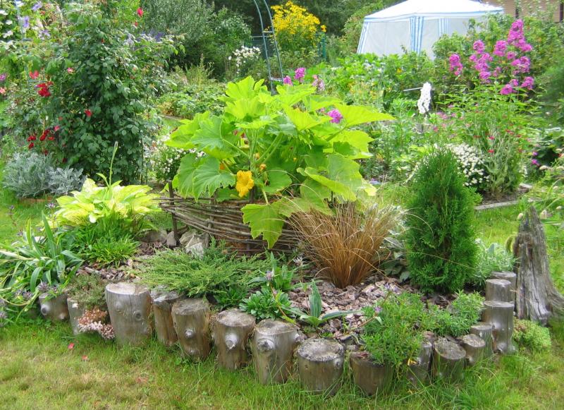 На пеньке посидеть... Патиссоны скоро созреют. А к осени и компост в бочке. (Там она, под патиссонами)