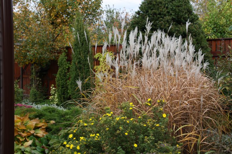 Стриженная ель обыкновенная - отличный фон для куртины мискантуса
