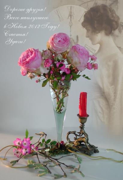 В композиции розы: "Pierre de Ronsard", "Ballerina", "Dijon Pompon ", декабрь 2011.