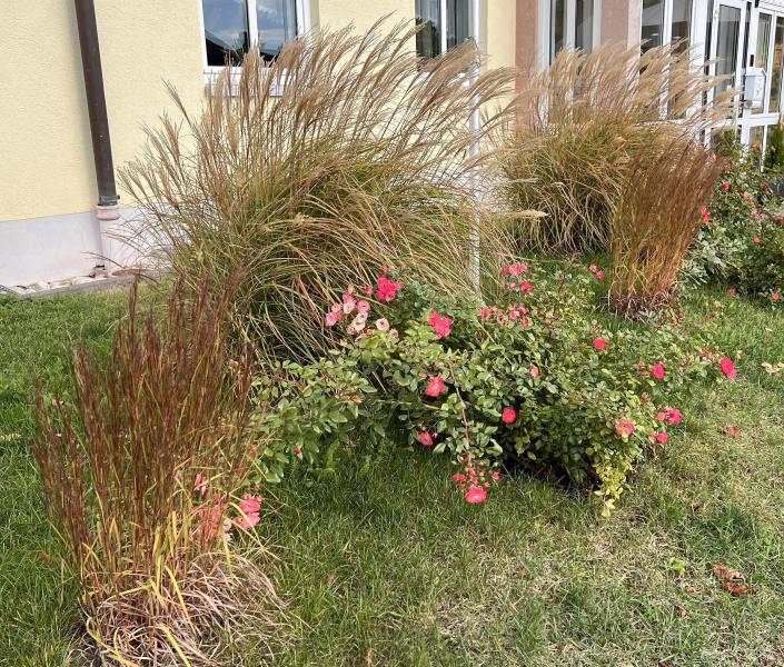 Schizachyrium scoparium в компании мискантусов и роз